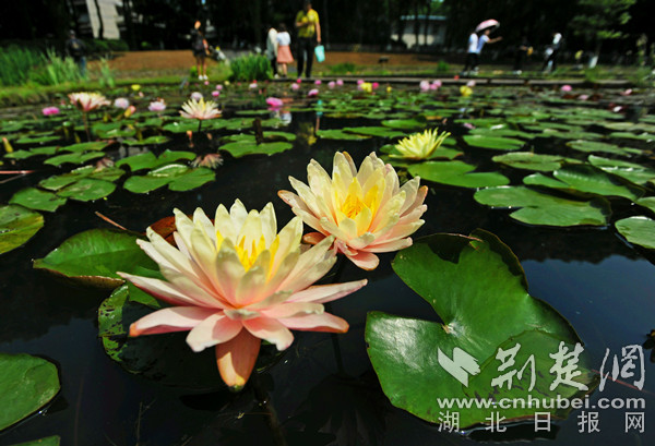 睡蓮展示區(qū),“水中女神”已經(jīng)蘇醒,進(jìn)入超長(zhǎng)花期。印度紅睡蓮、埃及藍(lán)睡蓮、墨西哥黃睡蓮、中國(guó)延藥睡蓮、泰國(guó)招財(cái)女神……武漢植物園睡蓮池臥虎藏龍,展示著世界各地的睡蓮名品。仿造睡蓮花瓣建造成的“八色睡蓮池”已經(jīng)上色完畢,紫、藍(lán)、黃、粉、紅,色彩大膽絢爛,如意蘊(yùn)流淌的藝術(shù)家畫作。