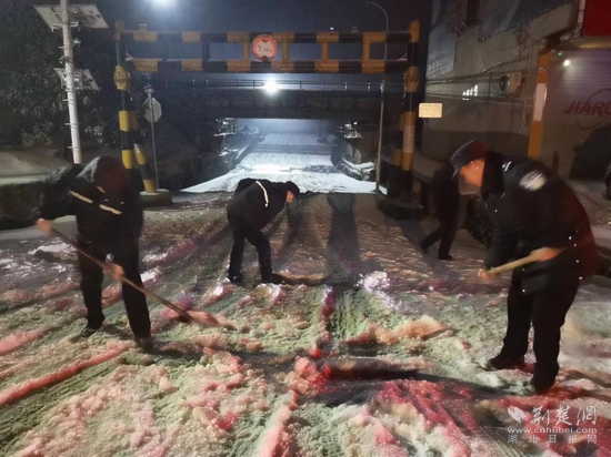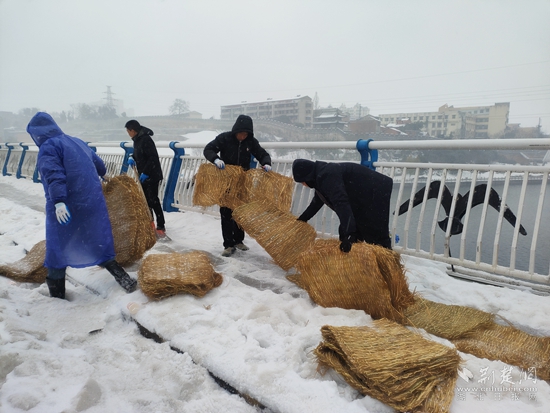 2月22日上午,在東洲橋路段掃雪現(xiàn)場,赤壁市建工集團工作人員正頂風冒雪手持鐵鍬、雪鏟等清掃工具,鏟除橋梁上的積雪,鋪設草毯防滑。