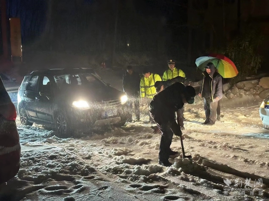 赤壁市公安局民警立即冒雪進行救助,最大限度為受困受阻車輛司乘人員提供幫助。同時對路面進行緊急清理,消除安全隱患,現(xiàn)場疏導車流,確保盡快恢復正常通行。
