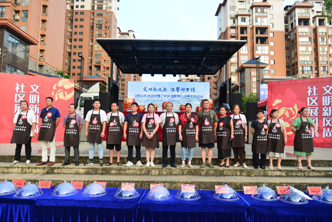 涼拌牛肉、盤龍草魚、海鮮粉絲煲、青椒小炒肉……舞臺(tái)下,居民有序排隊(duì)領(lǐng)取參賽美食,一邊品嘗一邊交流做菜心得,歡聲笑語充斥著整個(gè)活動(dòng)現(xiàn)場(chǎng)。