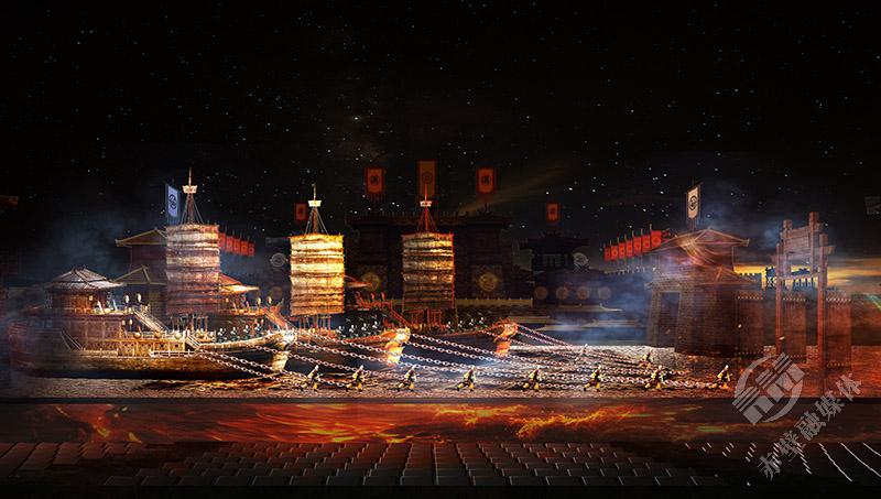 2000多年前,諸葛亮借的東風(fēng),是摧枯拉朽、克敵制勝的戰(zhàn)火雄風(fēng);2000多年后,三國赤壁古戰(zhàn)場(chǎng)借的東風(fēng),則是凝心聚氣、砥礪奮進(jìn)的時(shí)代之風(fēng)。演出將赤壁之戰(zhàn)這盤歷史大棋置于天地之間,以三國群雄為弈者,以演員和觀眾為棋子,利用光影特效與舞美裝置的變換,將戰(zhàn)役的多個(gè)關(guān)鍵情節(jié)進(jìn)行藝術(shù)化提煉與重構(gòu),運(yùn)用聲、光、電等現(xiàn)代舞美技術(shù),將歷史與現(xiàn)實(shí)、虛擬與真實(shí)融為一體,構(gòu)建起一個(gè)戰(zhàn)火紛飛、羽箭穿空的三國世界,讓赤壁之戰(zhàn)從史書中的符號(hào)躍升為可觸摸、可參與的精神場(chǎng)域。