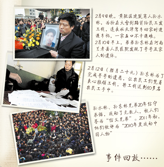 “信義兄弟”再行義舉。昨日,為繼承哥哥孫水林的遺愿,孫東林決定將社會(huì)各界送來的33.4萬余元獎(jiǎng)金和慰問金全部捐出,設(shè)立農(nóng)民工意外傷害幫扶基金。